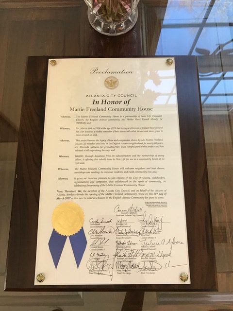 The Community House sits across the street from the Mattie Freeland Community Garden, also built in her honor shortly after her passing in 2007. The Garden will soon be expanded into the Mattie Freeland Park. Land for the park is now being acquired and funding sources for its eventual build-out are being identified. At the Community House dedication, Atlanta City Councilmember Ivory Young, not only presented a proclamation from the City, but also announced a $10,000 contribution from the Office of Atlanta City Council, District 3 towards the completion of the new greenspace, which will also be an official City of Atlanta park.
